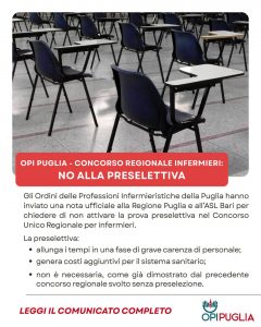 OPI PUGLIA: NO ALLA PRESELEZIONE DEL CONCORSO INFERMIERI, RISCHIO COLLASSO DEL SERVIZIO SANITARIO REGIONALE